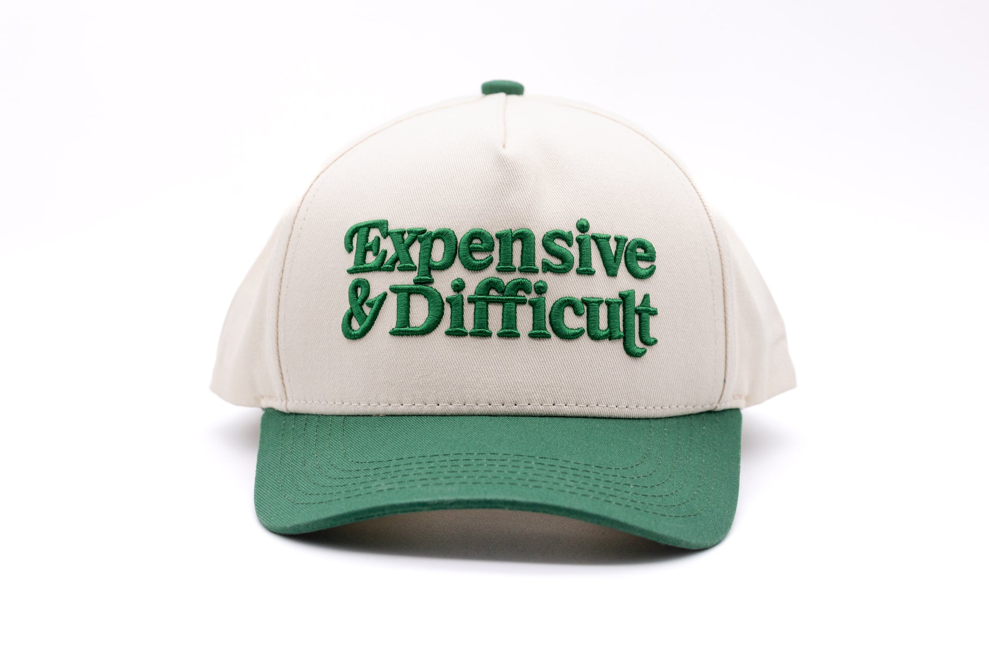 Quietly bold. Cream crown with green bill and raised green embroidery; a matching green top button ties it all together.