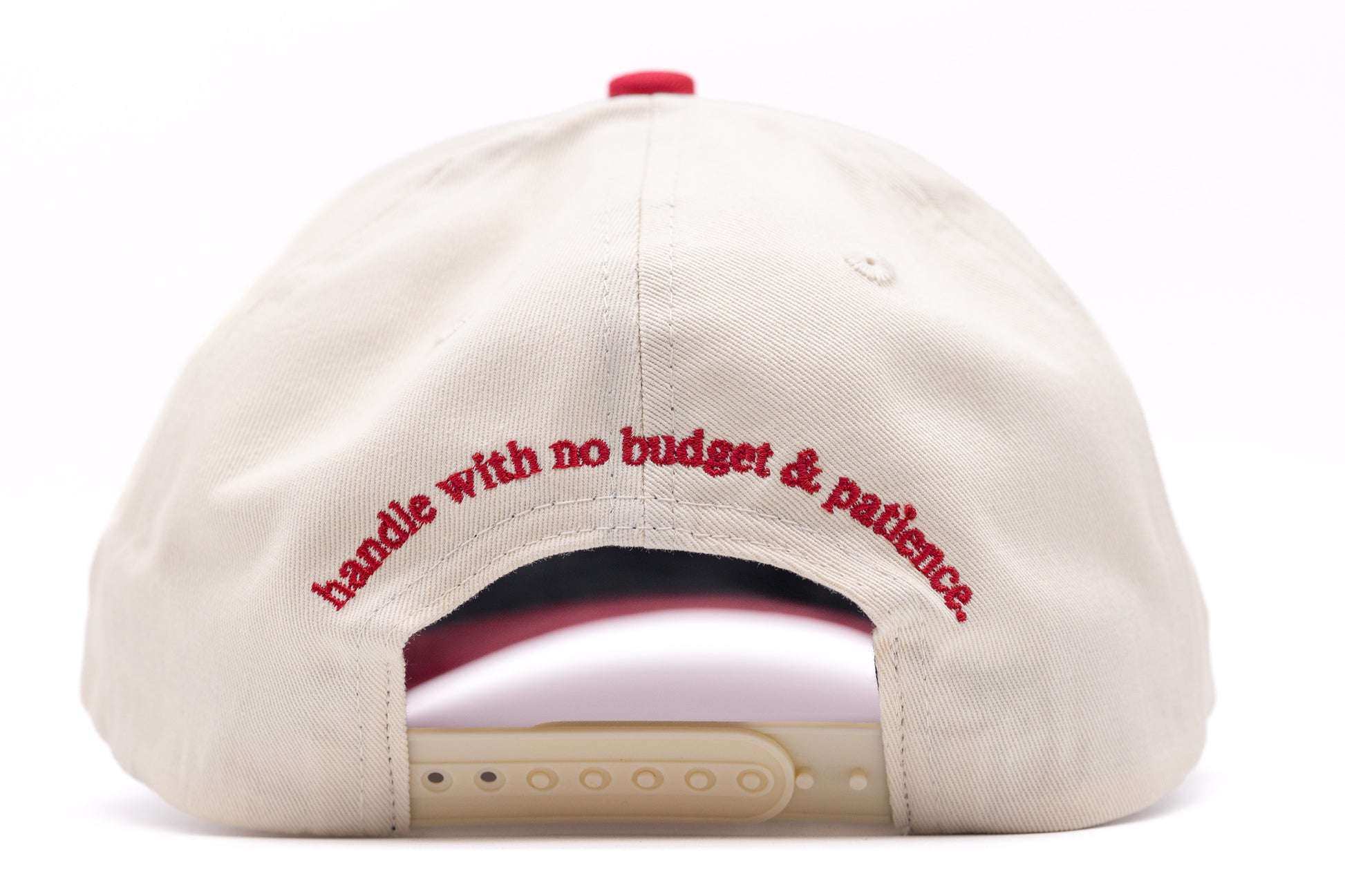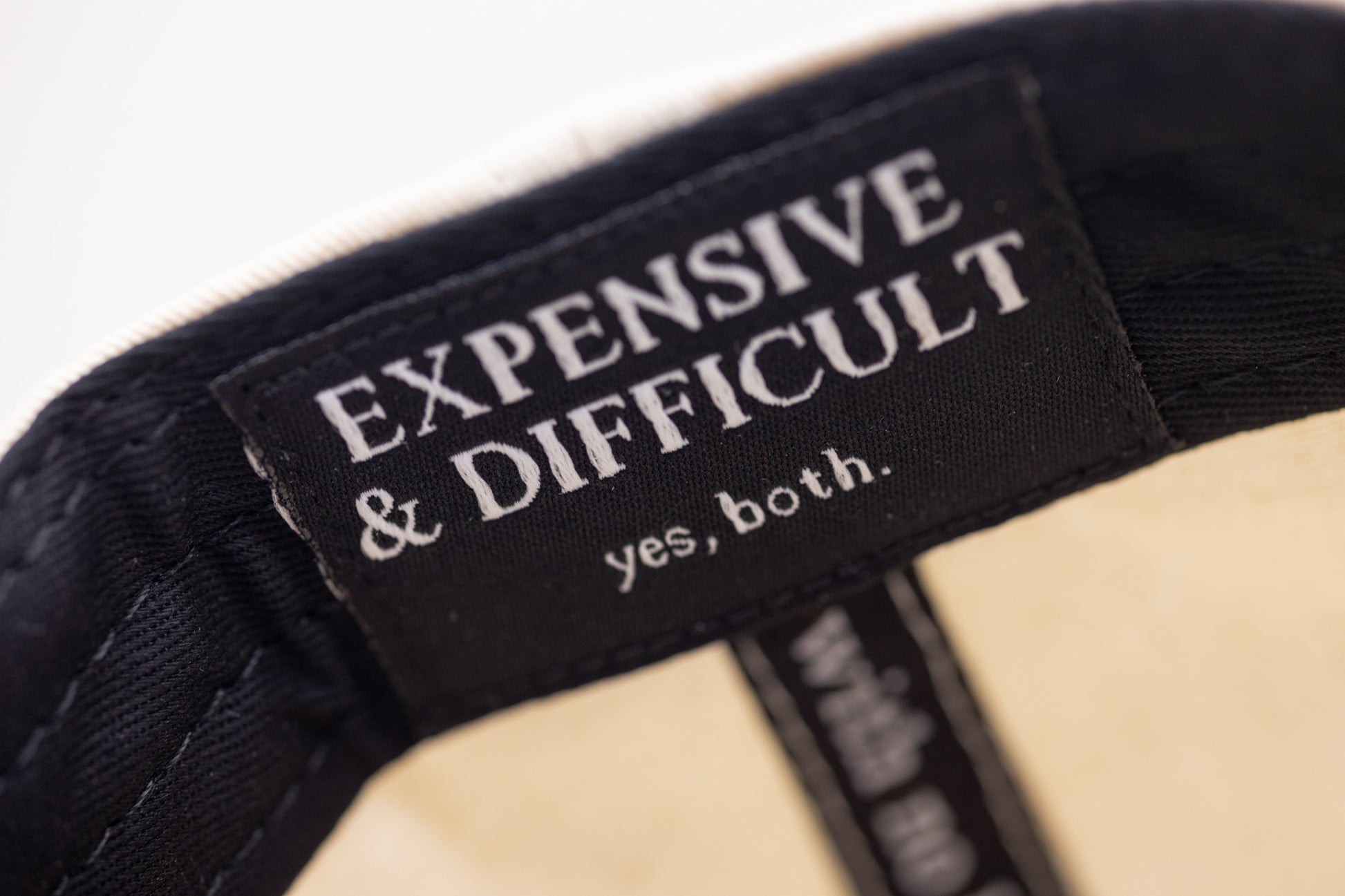 Own the room without saying a word. A cream crown, red bill, and raised red “Expensive & Difficult” embroidery—finished with a matching red top button.